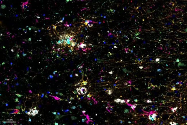 阿爾茨海默。ˋD)是一種復(fù)雜的神經(jīng)退行性疾病,以神經(jīng)纖維纏結(jié)、β-淀粉樣蛋白斑塊和神經(jīng)炎癥為特征。這些功能障礙會(huì)引發(fā)或加劇局部免疫反應(yīng)。因此,了解神經(jīng)免疫與空間環(huán)境的相互作用對(duì)于闡明AD發(fā)病機(jī)制至關(guān)重要。在這里,我們利用 Cell DIVE 的循環(huán)染色成像技術(shù)和 Aivia 的人工智能輔助空間分析技術(shù)來(lái)研究 AD 病理標(biāo)志周?chē)拿庖呒?xì)胞。