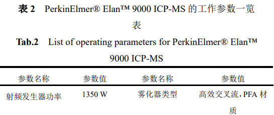 檢測(cè)儀器采用電感耦合等離子體質(zhì)譜儀(ICP-MS),配備有高效交叉流霧化器、Scott噴霧室和先進(jìn)的四極桿質(zhì)譜檢測(cè)系統(tǒng)、高靈敏度的離子檢測(cè)器。ICP-MS的操作條件如下表所示。