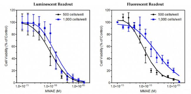 在進行特異性細胞活力測定之前,用不同濃度的單甲基 auristatin E (MMAE)(一種合成抗腫瘤劑)處理細胞 72 小時。對于 CellTiter-Glo® 測定,將 2 µL CellTiter-Glo® 液滴添加到 DropArray™ 板上的 2 µL 細胞液滴中。在室溫下培養(yǎng) 5 分鐘后,在 EnVision 2102 Multilabel Plate Reader (Perkin Elmer) 上讀取板。