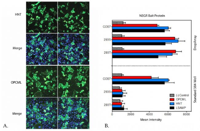 然后將表達 LSAMP、hNT 或 OPCML 的細胞與誘餌蛋白一起培養(yǎng)。使用 Alexa Fluor ® 488 標記的羊抗人IgG (H+L) 抗體檢測 NEGR1-hFc 結(jié)合。與任一板格式的非轉(zhuǎn)染細胞中的非特異性結(jié)合相比,觀察到響應(yīng)于 NEGR1-hFc 與 LSAMP、hNT 或 OPCML 的特異性結(jié)合,平均強度增加了 5 倍(圖 3B)。