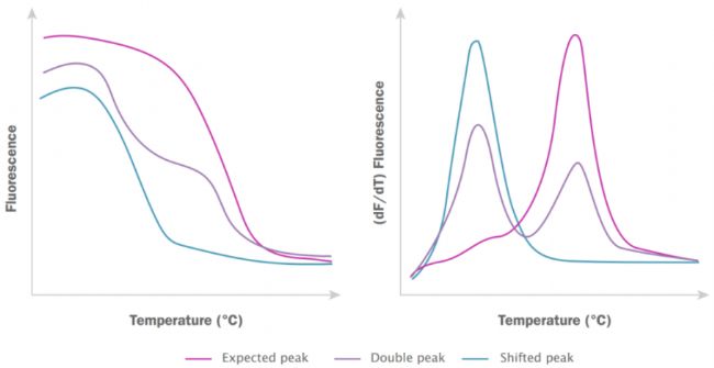 有時,某些擴(kuò)增子即使沒有其他產(chǎn)物,也會產(chǎn)生雙峰。當(dāng)擴(kuò)增子序列中不同區(qū)域的GC含量差異很大時,就會出現(xiàn)這種情況。這種堿基對含量的不均勻會導(dǎo)致低GC區(qū)域先發(fā)生部分變性,然后富含GC的區(qū)域在較高溫度下發(fā)生變性,最終出現(xiàn)兩個不同的峰值。哺乳動物CFTR基因就是一個明顯的例子。雖然這種現(xiàn)象很少見,但在進(jìn)行qPCR分析時仍需注意。