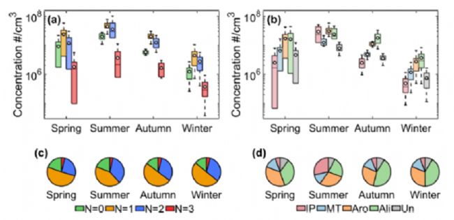 圖3 從覆蓋四季的長(zhǎng)期測(cè)量來(lái)看,覆蓋范圍更廣的OOMs總體特征。(a)和(c)分別為按含氮數(shù)分類(lèi)的OOMs四季濃度變化及濃度占比。(b)和(d)分別為按前體物(異戊二烯、單萜烯、芳香族化合物和脂肪族化合物)分類(lèi)的OOMs的四季濃度變化和濃度占比。