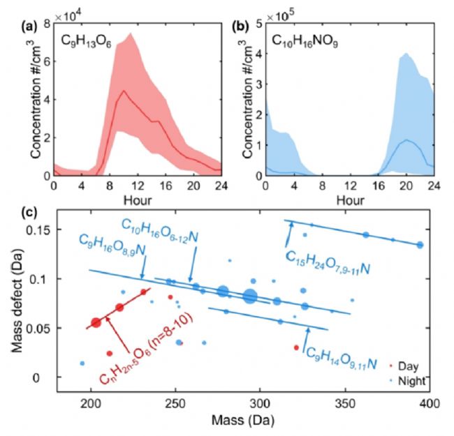 圖4 使用CI-Orbitrap識(shí)別出的大氣OOMs自由基。研究識(shí)別出的大氣C9H13O6自由基(a)和C10H16NO9自由基(b)的日變化。(c)一年中能測(cè)到的大氣OOMs自由基的質(zhì)量缺陷圖。