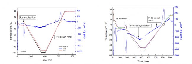 圖 5. 10%(左)和 5%(右)P188 溶液冷卻 / 加熱循環(huán)的溫度和 HFT 數(shù)據(jù)。兩種情況下在升溫過程中均檢測(cè)到 P188 + 冰的融化,HFT 測(cè)得的溫度與 DSC 和 XRD 測(cè)量結(jié)果一致。然而,HFT 未檢測(cè)到二次結(jié)晶。