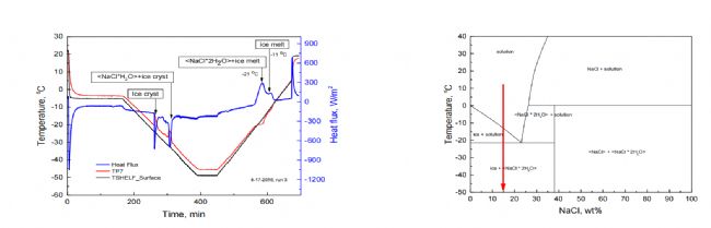 圖 3. 15% 氯化鈉溶液冷卻 / 加熱循環(huán)的溫度和 HFT 數(shù)據(jù)(左)以及氯化鈉 - 水體系的相圖(右)。冷卻過程:HFT 檢測(cè)到初級(jí)冰形成和二次 NaCl・2H₂O + 水結(jié)晶。升溫過程:HFT 檢測(cè)到共晶熔化和冰融化。升溫過程中 HFT 測(cè)得的轉(zhuǎn)變溫度(Te = - 21℃,TL = - 11℃)與相圖中的溫度(Te = - 21.4℃,TL = - 13.1℃)接近。