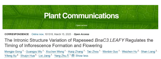 2025年3月15日,浙江大學(xué)朱楊課題組在《Plant Communications》(IF=9.4)上發(fā)表了題目為“The Intronic Structure Variation of Rapeseed BnaC3.LEAFY Regulates the Timing of Inflorescence Formation and Flowering”的研究論文。該文章通過(guò)DAP-seq技術(shù)聯(lián)合RNA-seq,解析了甘藍(lán)型油菜BnaC3.LFY早花的遺傳機(jī)制,為甘藍(lán)型油菜早熟育種提供了基因資源和理論依據(jù)。