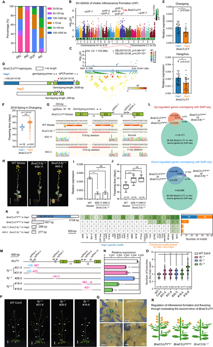 1、本研究通過(guò)對(duì)300份核心油菜種質(zhì)的重測(cè)序分析,鑒定出42,384個(gè)高質(zhì)量SV。為了識(shí)別與花序形成相關(guān)的SVs,作者進(jìn)行了全基因組關(guān)聯(lián)研究(SV-GWAS)。結(jié)果顯示有7個(gè)遺傳位點(diǎn)以及11個(gè)相關(guān)的候選基因與早花序形成相關(guān)。并發(fā)現(xiàn)位于 BnaC3.LFY 基因第二內(nèi)含子的LINE反轉(zhuǎn)錄轉(zhuǎn)座子插入(Hap1 單倍型)與油菜早花表型顯著相關(guān)。