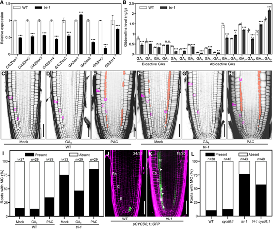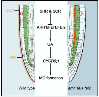 為了進(jìn)一步理解ARH1、FEI1和FEI2調(diào)節(jié)GT模式的機(jī)制,作者通過外源GA和PAC(GA生物合成抑制劑)處理結(jié)合突變體分析,結(jié)果表明RLKs通過調(diào)節(jié)GAs的合成來影響根基本組織發(fā)育。同時通過共聚焦和RT-qPCR分析根尖CYCD6;1基因的表達(dá)變化,明確了CYCD6;1在根基本組織發(fā)育中的作用。以上結(jié)果,提出并證明了SHR/SCR-ARH1/FEI1/FEI2-GAs-CYCD6;1的根基本組織發(fā)育調(diào)控模塊。即在根發(fā)育早期,受體激酶通過調(diào)節(jié)GAs的合成抑制CYCD6;1在根尖內(nèi)皮層中的異位表達(dá),進(jìn)而抑制中皮層形成,精確調(diào)控根基本組織的發(fā)育。