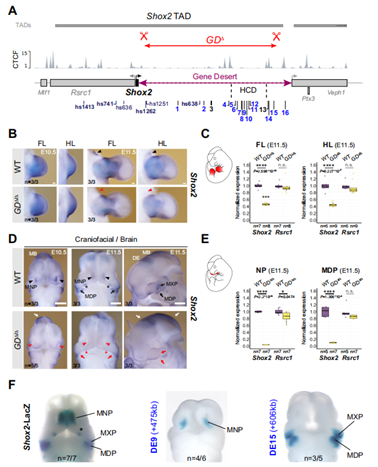 圖3. 基因沙漠缺失減少了肢體和顱面隔室中的Shox2。
