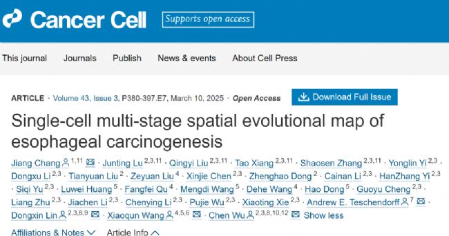 2025年3月10日,Cancer Cell以封面論文形式發(fā)表了題為 Single-cell Multi-stage Spatial Evolutional Map of Esophageal Carcinogenesis 的重要研究成果。研究團(tuán)隊(duì)扎根河南林州食管癌醫(yī)院(原姚村衛(wèi)生院),通過(guò)長(zhǎng)期跟蹤隨訪,獲得了大量珍貴的食管癌變?nèi)^(guò)程組織樣本。在此基礎(chǔ)上,團(tuán)隊(duì)運(yùn)用前沿的單細(xì)胞空間轉(zhuǎn)錄組技術(shù),成功繪制了全球首個(gè)單細(xì)胞分辨率的食管多階段癌變“時(shí)-空 ”動(dòng)態(tài)演化圖譜,實(shí)現(xiàn)了對(duì)食管癌變?nèi)^(guò)程的系統(tǒng)性解析。研究突破傳統(tǒng)腫瘤線性演化理論的局限,創(chuàng)新性地提出“癌變空間演化”理論框架,首次揭示了腫瘤相關(guān)成纖維細(xì)胞(CAF)與侵襲性上皮細(xì)胞在癌前病變階段就可形成關(guān)鍵交互生態(tài)位(CAF-Epi niche)的腫瘤演化新機(jī)制。這一關(guān)鍵生態(tài)位可作為多種鱗狀細(xì)胞癌的癌前病變進(jìn)展風(fēng)險(xiǎn)預(yù)測(cè)的重要依據(jù),不僅為系統(tǒng)解析食管癌病因和演進(jìn)機(jī)制奠定了重要理論基礎(chǔ),更為建立腫瘤早篩早診的“新林州模式”提供了科學(xué)依據(jù),對(duì)推動(dòng)食管癌的早診早治具有重要的臨床實(shí)踐價(jià)值。
