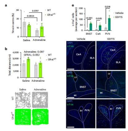 野生型小鼠腹腔注射甲腎上腺素后可引起焦慮樣行為,但GFRAL敲除小鼠并未出現(xiàn)類似變化。急性束縛應(yīng)激也可誘發(fā)野生型小鼠焦慮樣行為,GFRAL敲除小鼠并未出現(xiàn)類似變化。單次腹腔注射GDF15可引起焦慮樣行為,可顯著引起中央杏仁核、終紋床核、下丘腦室旁核等腦區(qū)神經(jīng)元激活。