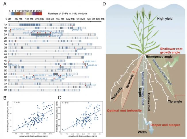 最后,為了探究小麥根系構(gòu)型與大田產(chǎn)量之間的相關(guān)性,本研究利用小麥自然群體根系構(gòu)型性狀和大田產(chǎn)量相關(guān)性狀的GWAS結(jié)果,對產(chǎn)量和根系相關(guān)性狀的QTL進行聯(lián)合分析,發(fā)現(xiàn)有20個調(diào)控根系發(fā)育的QTL位點同時與產(chǎn)量位點共定位,表明這些共定位的QTLs同時調(diào)控著根系構(gòu)型和田間產(chǎn)量,可能是未來通過改良根系構(gòu)型提升小麥田間產(chǎn)量的重要基因資源;谏鲜鼋Y(jié)果,本研究構(gòu)建了根系性狀與產(chǎn)量的多元線性回歸模型,并基于18個RSA性狀提出了小麥高產(chǎn)的理想根系構(gòu)型模型及優(yōu)化策略(圖2)。