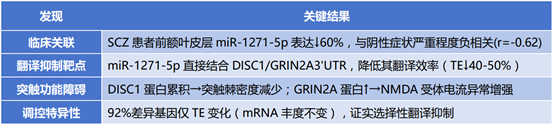 研究結(jié)論:miR-1271-5p作為翻譯“剎車器”,通過(guò)結(jié)合靶基因3'UTR直接抑制核糖體起始(非降解mRNA),其失靈導(dǎo)致突觸蛋白失控合成。該研究不僅揭示精神分裂癥的翻譯調(diào)控新機(jī)制,更提供了靶向RNA的精準(zhǔn)干預(yù)思路。