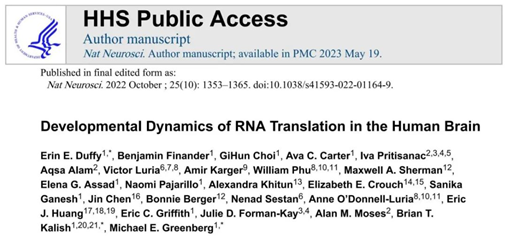 3. Duffy EE, Finander B, Choi G, Carter AC, Pritisanac I, Alam A, Luria V, Karger A, Phu W, Sherman MA, Assad EG, Pajarillo N, Khitun A, Crouch EE, Ganesh S, Chen J, Berger B, Sestan N, O'Donnell-Luria A, Huang EJ, Griffith EC, Forman-Kay JD, Moses AM, Kalish BT, Greenberg ME. Developmental dynamics of RNA translation in the human brain. Nat Neurosci. 2022 Oct;25(10):1353-1365.