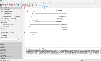 (3)這樣,我們就得到了系統(tǒng)發(fā)育樹圖。注意這里有兩張圖,第一張original tree是可以通過分支長度表達(dá)遺傳距離的圖,第二張bootstrap consensus tree是有自展值的圖。一般情況下選用origin tree圖即可。