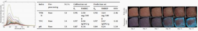 肉類食品在冷藏儲(chǔ)存過程中,其品質(zhì)會(huì)隨著時(shí)間推移逐漸下降,總揮發(fā)性鹽基氮(TVB-N)、總活菌數(shù)(TVC)和 pH 是評(píng)估豬肉新鮮度的重要指標(biāo)。中國(guó)農(nóng)業(yè)大學(xué)研究團(tuán)隊(duì)利用紫外光激發(fā)生物熒光成像技術(shù),通過PLSR方法根據(jù)原始熒光光譜構(gòu)建定量模型,實(shí)現(xiàn)冷藏豬肉新鮮度指標(biāo)(TVB-N/TVC/pH)的無(wú)損監(jiān)測(cè)。