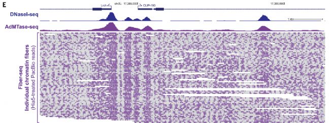 來自華盛頓大學的研究團隊開發(fā)了Fiber-seq 技術,通過非特異性N6- 腺嘌呤甲基轉移酶(m6A-MTase)將單個染色質纖維的結構 “標記” 在 DNA 模板上,結合PacBio HiFi測序,實現了 kilobase 級染色質纖維的核苷酸分辨率分析,該項研究成果于2020年發(fā)表于Science雜志。