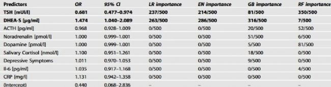 圖 1 已展示精簡(jiǎn)生物標(biāo)志物有效,而 DHEA-S (高)、TSH(低)是該組的核心指標(biāo)(表2),二者的預(yù)測(cè)價(jià)值是精簡(jiǎn)生物標(biāo)志物組性能提升的關(guān)鍵。主要表現(xiàn)在:① 特征重要性:在 500 次數(shù)據(jù)驗(yàn)證中,DHEA-S 在邏輯回歸模型里 237 次被列為 “最關(guān)鍵指標(biāo)”,TSH 在梯度提升樹模型里 263 次被列為 “最關(guān)鍵指標(biāo)”,遠(yuǎn)超其他指標(biāo)(如去甲腎上腺素僅 0 次、多巴胺0次);② 風(fēng)險(xiǎn)關(guān)聯(lián):DHEA-S 水平每升高 1 單位,孩子試過自殺的風(fēng)險(xiǎn)增加 47%(OR=1.47,95% CI:1.04-2.09);TSH 水平每降低 1 單位,自殺風(fēng)險(xiǎn)增加 32%(OR=0.68,95% CI:0.48-0.97)—— 這兩個(gè)指標(biāo)的影響穩(wěn)定且突出,是識(shí)別高自殺風(fēng)險(xiǎn)的核心線索。