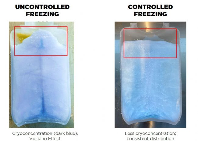Figure 1: Visualization of the volcano effect in bottles occurring in uncontrolled freezing, compared to consistent distribution in controlled freezing. 圖 1:不受控冷凍時瓶子中火山效應(yīng)的可視化,與受控冷凍時的一致分布進行比較。