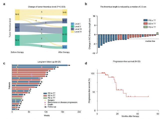 2020年3月至2023年10月期間,該單中心研究最終入組25例接受治療的患者(患者納入及干預(yù)過程如圖1)。其中,11例患者TT水平降低。新輔助治療可顯著降低腫瘤血栓患者的Mayo水平,其余14例患者血栓水平穩(wěn)定,Mayo水平均未升高。25例患者中有14例血栓水平穩(wěn)定,其中13例患者TT長度減少,TT長度的中位變化為- 2.3 cm(范圍:- 7.1至1.1 cm)。新輔助治療12周后,25例患者中有11例IVC-TT達(dá)到PR(腫瘤血栓長度縮小>30%),但Mayo水平未升高