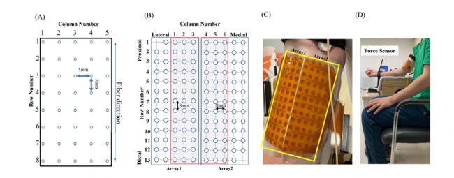 人體表面肌電實(shí)驗(yàn) :選取9 名健康受試者 (28.9 ± 4.8 歲),采集其肱二頭肌EMG信號(hào)。使用兩個(gè)高密度電極陣列(圖2B和2C),每個(gè)電極矩陣由64個(gè)通道組成,電極間距離(IED)為8mm,排列在5列乘13行的網(wǎng)格中(圖2B和2C)。清潔皮膚后,平行于纖維方向?qū)⒁粋(gè)通道陣列放置在肱二頭肌的外側(cè)上,另一個(gè)通道陣列放置在內(nèi)側(cè)上,并用彈性帶固定。在肘部放置接地電極。受試者背部完全靠在靠背上,前臂放置(所有情況下均為右側(cè))在定制的測(cè)力裝置上(圖2D)。