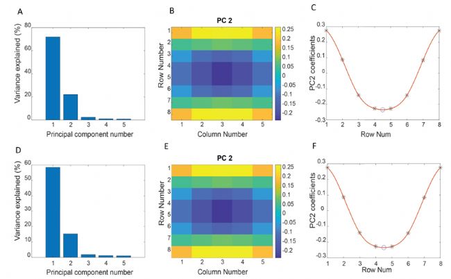 圖6. 從實(shí)驗(yàn)高密度表面肌電信號(hào)估計(jì)肌肉IZ的一個(gè)例子。A:第二主成分系數(shù)的空間分布。對(duì)于每一列,最小系數(shù)位于第5或第6行附近,并且系數(shù)沿著纖維方向逐漸增加。B:相鄰雙極信號(hào)之間的互相關(guān)系數(shù)的分布。C:雙極信號(hào)的均方根分布。D:第1列第2分量系數(shù)的樣條插值。E.第1列互相關(guān)系數(shù)的樣條插值。F:第1列的配對(duì)雙極信號(hào)的均方根值
