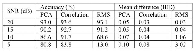 表 2 以 “準(zhǔn)確率” (即,IZ 定位準(zhǔn)確率,即 “估算 IZ 位置與真實(shí) IZ 位置一致” 的試驗(yàn)次數(shù)占總次數(shù)的比例,數(shù)值越高方法越可靠。) 和 “平均差異(IED,估算 IZ 位置與真實(shí) IZ 位置的平均差值,單位為 “電極間距,數(shù)值越小定位精度越高。本實(shí)驗(yàn)電極間距,8mm)” 為核心指標(biāo),量化了三種方法(即,PCA:基于單極信號(hào)的第二主成分系數(shù)分析;Correlation:基于雙極信號(hào)的互相關(guān)分析;RMS:基于雙極信號(hào)的均方根幅度分析)在不同 SNR 下的表現(xiàn),PCA的PC2方法在SNR 從 20dB 降至 5dB 時(shí),準(zhǔn)確率從 93.0% 降至 80.8%,平均差異從 0.05 IED 增至 0.10 IED,下降幅度平緩。即使在 SNR=5dB(強(qiáng)噪聲)下,仍保持 80% 以上的準(zhǔn)確率,遠(yuǎn)超 RMS 方法(13.0%),互相關(guān)法在高 SNR(20dB)時(shí)準(zhǔn)確率略高(93.6% vs 93.0%),但低 SNR(5dB)時(shí)兩者差距縮。83.8% vs 80.8%),且平均差異僅差 0.02 IED(0.08 vs 0.10),說(shuō)明 PC2 方法在全局噪聲下已接近傳統(tǒng)最優(yōu)方法的性能。
