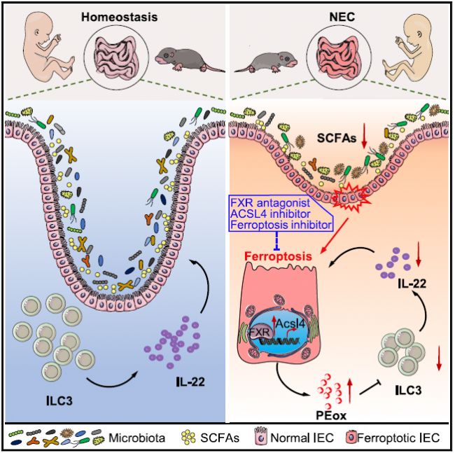 Bile acid receptor FXR promotes intestinal epithelial ferroptosis and subsequent ILC3 dysfunction in neonatal necrotizing enterocolitis. Immunity. 2025 Mar 1 .