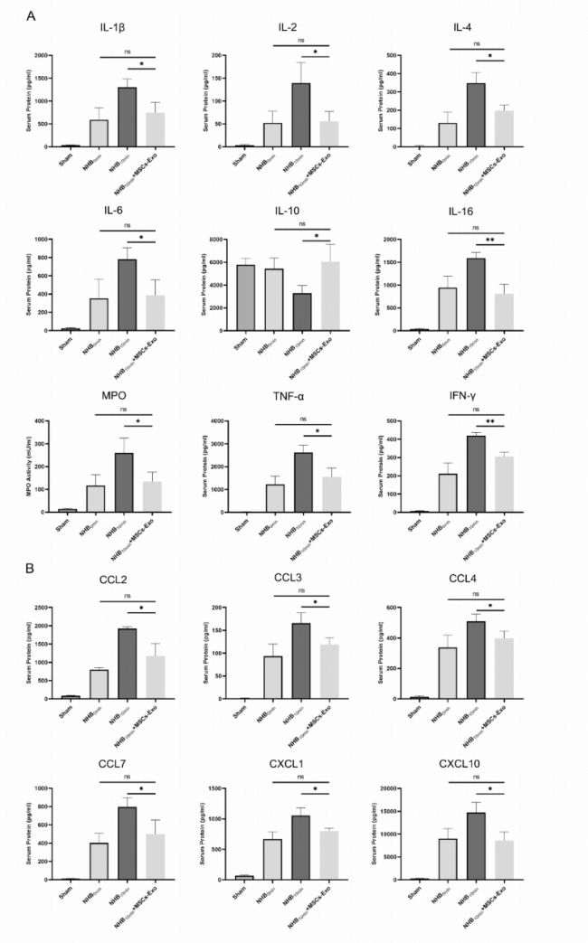 研究中,團(tuán)隊(duì)采用LabEx多因子液相芯片平臺(tái)(LX-MultiDTM-31),對(duì)移植后小鼠血清中31種炎癥因子與趨化因子進(jìn)行精準(zhǔn)定量。結(jié)果顯示,MSCs-Exo治療組顯著下調(diào)IL-1β、TNF-α、CXCL1等促炎因子,同時(shí)上調(diào)抗炎因子IL-10,證實(shí)其通過(guò)抑制Kupffer細(xì)胞焦亡-NLRP3炎癥小體通路阻斷級(jí)聯(lián)炎癥反應(yīng)。LabEx平臺(tái)的高靈敏度多靶點(diǎn)檢測(cè)能力,為闡明外泌體免疫調(diào)控機(jī)制提供了關(guān)鍵數(shù)據(jù)支持。