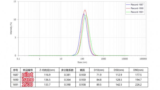 通過安拓思三款不同的高壓均質(zhì)機(jī)對(duì)醬油進(jìn)行處理,在1000bar的高壓條件下進(jìn)行多輪循環(huán)均質(zhì)。由實(shí)驗(yàn)粒徑圖(圖2)可以看出,AH-pilot這款設(shè)備的處理效果最好:粒徑由初始的69.92μm 降至 177.5 nm。