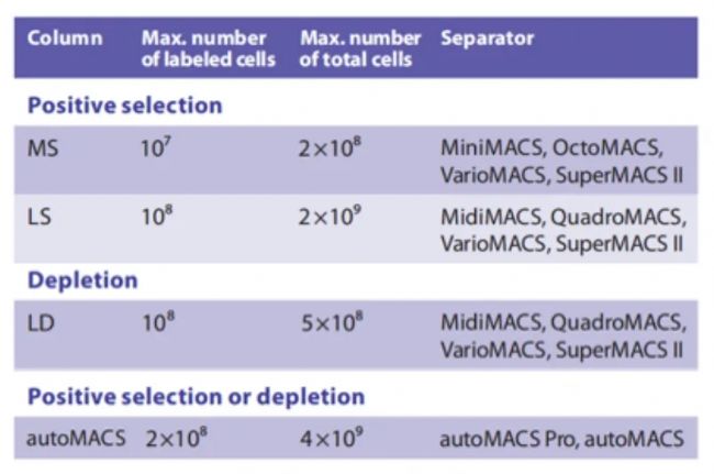 ❖ 確認分選柱:對于不同類型的分選柱選擇,關鍵是不要超過推薦的細胞量,否則會使柱子過載,導致分選效果不佳?筛鶕募毎倲岛湍繕思毎麛、分選策略選擇對應的分選柱,可參考下圖。對于具體使用的磁珠,參考每個磁珠說明書附的數據表,進行分選柱的選擇。