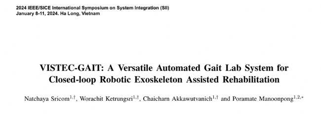 N. Sricom, W. Ketrungsri, C. Akkawutvanich, and P. Manoonpong, "VISTEC-GAIT: A Versatile Automated Gait Lab System for Closed-loop Robotic Exoskeleton Assisted Rehabilitation," in Proceedings of the 2024 IEEE/SICE International Symposium on System Integration (SII), Ha Long, Vietnam, 2024, DOI:10.1109/SII58957.2024.10417608.