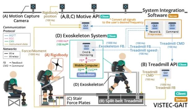 為此,泰國維迪亞科學(xué)技術(shù)學(xué)院(VISTEC)的Poramate Manoonpong研究團(tuán)隊研制了一個具有實用的圖形用戶界面(GUI)的多儀器集成架構(gòu),構(gòu)建成一個用于閉環(huán)機(jī)器人外骨骼輔助康復(fù)的多功能自動化步態(tài)實驗室系統(tǒng)(稱為 VISTEC-GAIT),旨在突破設(shè)備協(xié)同壁壘,提升外骨骼輔助康復(fù)的安全性與精準(zhǔn)性。
