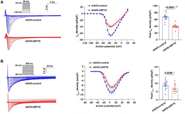 研究分離USP10過(guò)表達(dá)的小鼠成年心室心肌細(xì)胞,檢測(cè)其離子通道電流與動(dòng)作電位:全細(xì)胞電壓鉗顯示,小鼠心肌細(xì)胞INa密度顯著降低且失活閾正向偏移,晚INa無(wú)變化,ICa-L密度降低但激活/失活特性不變,Ito、IK1、Iss無(wú)組間差異;在表達(dá)人源鉀通道的HEK293細(xì)胞中,USP10也不影響人類Ito、IKr特性。動(dòng)作電位檢測(cè)發(fā)現(xiàn),靜息膜電位無(wú)差異,但APA、Vmax、APD90和APD50均降低,提示INa降低與傳導(dǎo)異常相關(guān),ICa-L減少或致APD降低。此外,USP10過(guò)表達(dá)顯著降低小鼠心臟Nav1.5蛋白表達(dá),而相關(guān)心律失常離子通道基因mRNA表達(dá)無(wú)差異。