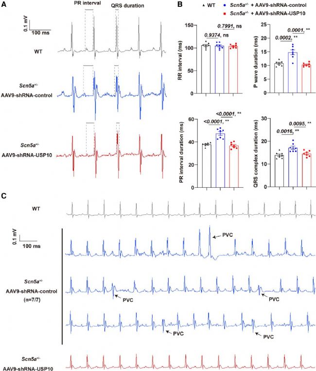 圖2. USP10過(guò)表達(dá)導(dǎo)致小鼠心臟傳導(dǎo)阻滯