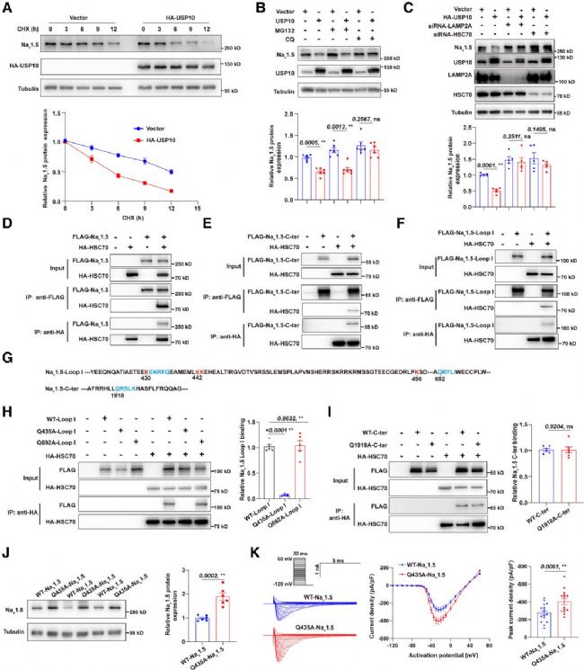 研究探究USP10促進(jìn)Nav1.5的CMA降解機(jī)制:因Nav1.5的 EKRFQ431-435基序緊鄰USP10結(jié)合位點(diǎn)K430,推測(cè)其影響 Nav1.5與HSC70的結(jié)合,實(shí)驗(yàn)證實(shí)過(guò)表達(dá)USP10可顯著增強(qiáng)二者結(jié)合。進(jìn)一步發(fā)現(xiàn)USP10 能降低Nav1.5泛素化水平,經(jīng)突變實(shí)驗(yàn)驗(yàn)證,K430是其去泛素化的關(guān)鍵位點(diǎn),K430R突變可阻斷該作用,還能抑制USP10對(duì)Nav1.5表達(dá)及INa密度的下調(diào)效應(yīng),揭示了去泛素化與 CMA偶聯(lián)降解Nav1.5的新機(jī)制。