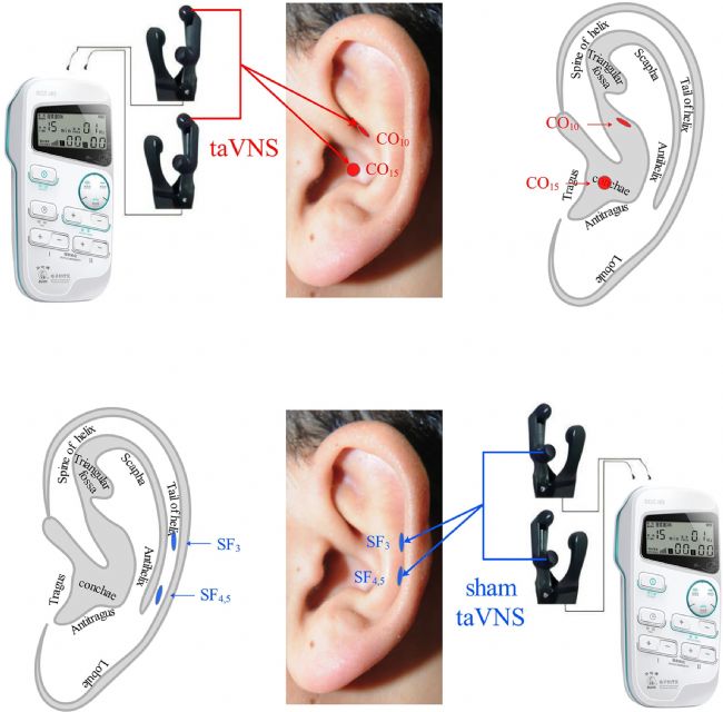 圖1. 經(jīng)顱迷走神經(jīng)刺激干預(yù)(taVNS)與假經(jīng)顱迷走神經(jīng)刺激干預(yù)