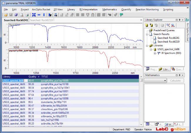 使用Labcognition Panorama軟件和免費(fèi)的美國地質(zhì)調(diào)查局?jǐn)?shù)字光譜庫,對上述光譜進(jìn)行了庫檢索。樣本被成功識別為鋁礬石、綠泥石、伊利石和火云母。圖4展示了火云母光譜的檢索結(jié)果截圖。值得注意的是,Arcoptix FT- NIR光譜儀(上方藍(lán)色)的光譜分辨率甚至高于數(shù)據(jù)庫中的光譜(下方紅色),使得細(xì)微的光譜特征得以區(qū)分。