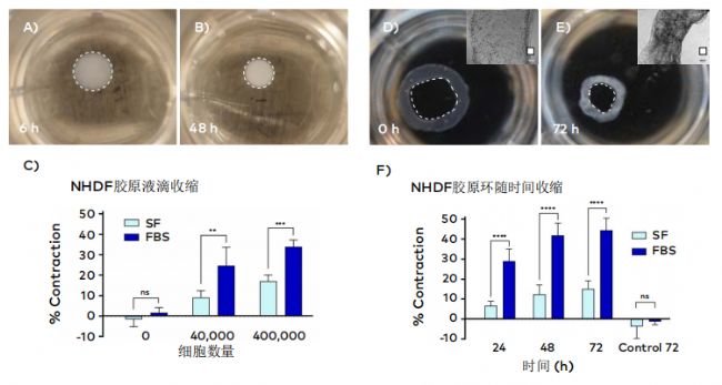 試驗選用新生兒人真皮成纖維細(xì)胞(NHDFs),搭配CELLINK高純度1型膠原蛋白作為生物墨。液滴樣本分別混合0、40,000、400,000個細(xì)胞,環(huán)形樣本則混合100萬個細(xì)胞(含無細(xì)胞對照組),分別在有血清(FBS)和無血清(SF)培養(yǎng)基中培養(yǎng)48-72小時,全程監(jiān)測收縮率與細(xì)胞活力。