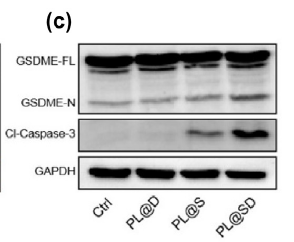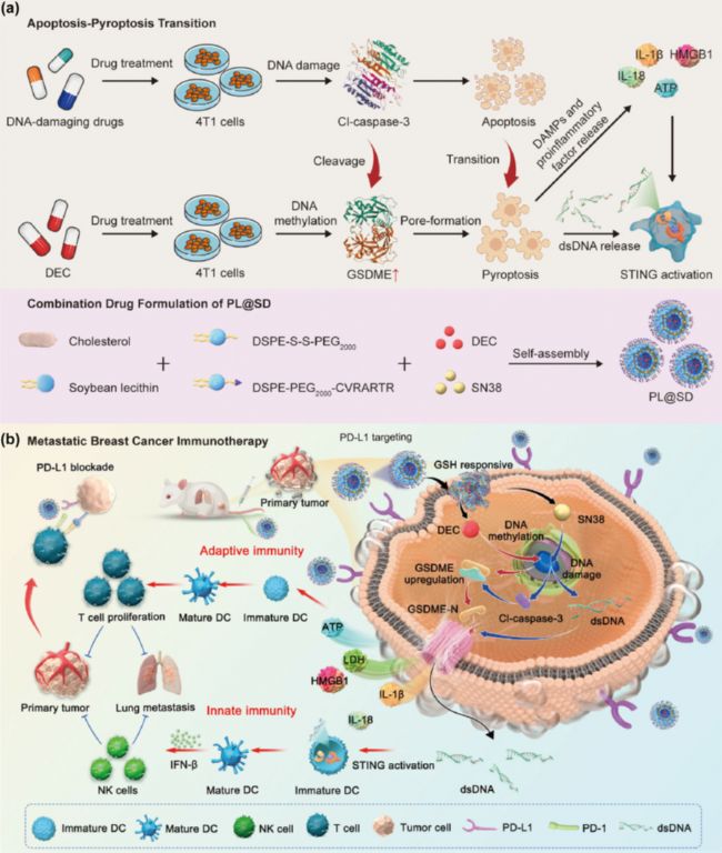 - 雙機制協(xié)同激活:PL@SD 在腫瘤內(nèi)釋放 DEC/SN38,一方面通過 “caspase-3 切割 GSDME” 實現(xiàn)凋亡向焦亡轉(zhuǎn)換(釋放免疫刺激信號),另一方面通過焦亡孔道促進腫瘤 DNA 釋放,激活 cGAS-STING 通路,最終同步喚醒適應(yīng)性與先天性免疫。
