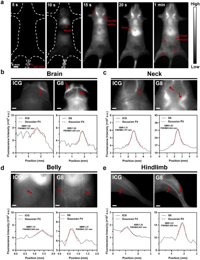 在腦、頸、腹、后肢四部位與ICG對比證實Cy-NIR-II-G8的血管成像優(yōu)勢(圖4b-e):高斯擬合顯示其信背比(SBR=1.27-1.81)顯著高于ICG(1.12-1.51),半高寬(FWHM=0.367-0.664 mmvs ICG's 0.606–0.847 mm)更窄。即使在厚組織顱骨區(qū)域仍可分辨血管,而ICG因短波長散射嚴重且肝攝取快完全失效。Cy-NIR-II-G8注射后血管信號清晰維持超1小時,凸顯其長循環(huán)穩(wěn)定性。該探針僅需20 nmol劑量、0.2 W cm⁻²激光功率及≤100 ms曝光,即可在微創(chuàng)條件下實現(xiàn)高對比度血管成像。其卓越性能源于三大本質特性:快速全身分布與穩(wěn)定循環(huán)動力學、NIR-II窗口內散射抑制、高量子產率——這些協(xié)同效應使Cy-NIR-II-G8成為臨床實時影像導航介入治療的理想制劑。