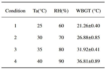 研究以濕球黑球溫度(WBGT)為核心自變量,設置四組溫濕度條件,具體參數(shù)如下: