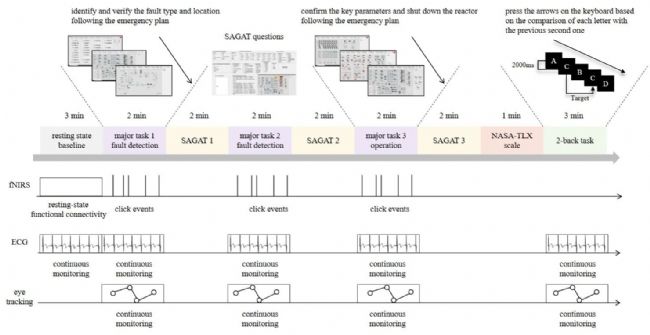 研究者基于 MATLAB 開發(fā)了虛擬中央控制室軟件,模擬核電站典型的監(jiān)測、檢查、響應和溝通任務。實驗程序(圖3)包含基線靜息、三項主要的故障檢測與處理任務(如蒸汽發(fā)生器傳熱管破裂 SGTR 等事故處理),以及后續(xù)的心理測量環(huán)節(jié)。被試在每組環(huán)境中暴露總時長約120分鐘,完成以上任務和測量。