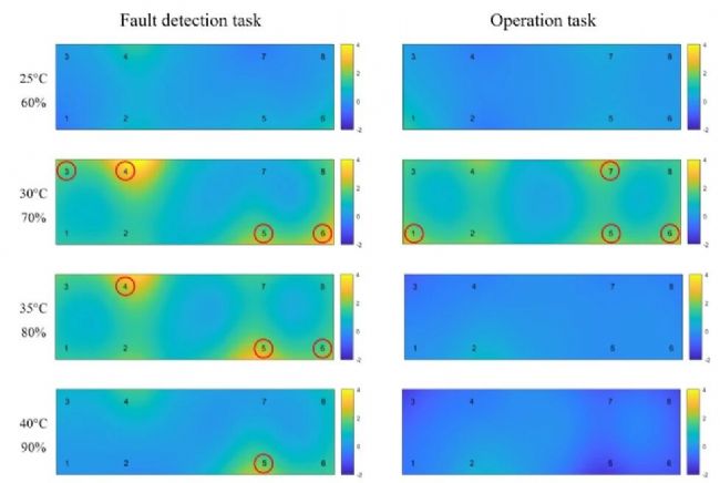 圖7. 熱力圖。第 1 行:各任務的興趣區(qū)(AOI)設置;第 2-5 行:對應工況 1-4;第 1-3 列:主要任務 1(故障檢測任務)的興趣頁;第 4-6 列:主要任務 2(故障檢測任務)的興趣頁;第 7-8 列:主要任務 3(操作任務)的興趣頁;第 9 列:2-back 任務