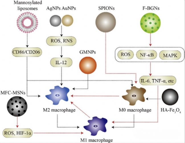 圖2 多種納米載體對巨噬細胞極化的影響(紅線-向M2亞型極化;黑線-向M1亞型極化)