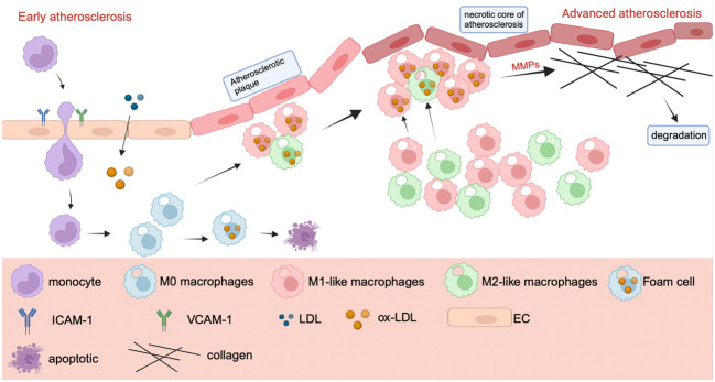 動脈粥樣硬化全病程以炎癥為核心,巨噬細胞極化失衡是關(guān)鍵環(huán)節(jié)。內(nèi)皮細胞受刺激后釋放炎癥介質(zhì),招募單核細胞進入動脈壁并分化為巨噬細胞:M1型吞噬氧化低密度脂蛋白(ox-LDL)形成泡沫細胞,聚集形成斑塊脂質(zhì)核心,同時分泌基質(zhì)金屬蛋白酶(MMPs)破壞血管膠原纖維,導致斑塊破裂;M2型通過抑制炎癥、促進脂質(zhì)代謝延緩斑塊進展,但隨疾病進展數(shù)量減少。表觀遺傳修飾、miRNA調(diào)控、自噬異常等參與極化調(diào)控,如三氧化二砷通過調(diào)節(jié)自噬平衡極化,Kallistatin可減少M1樣巨噬細胞浸潤。