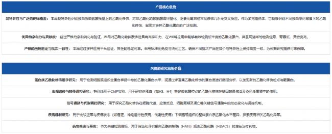 杭州斯達特生物科技有限公司自主研發(fā)的 "乙;嚢彼嵬枚嗫寺】贵w(Acetyllysine Rabbit Polyclonal Antibody)"(貨號:S0B0655),是一款具有高特異性、高親和力及廣泛適用性的蛋白質(zhì)翻譯后修飾檢測抗體。本品采用精心設計的乙酰化賴氨酸(Acetyllysine, Ac-K)修飾肽段作為免疫原,通過免疫兔宿主并親和純化制備而成,能夠特異性識別多種蛋白質(zhì)賴氨酸殘基上的乙酰化修飾,在蛋白質(zhì)印跡(WB)、免疫沉淀(IP)、免疫熒光(IF)及染色質(zhì)免疫沉淀(ChIP)等多種應用中表現(xiàn)卓越,是表觀遺傳學、信號轉(zhuǎn)導調(diào)控及代謝疾病研究的重要工具。