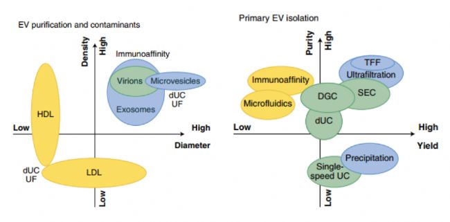 對于治療性外泌體,終產(chǎn)物的純度對于臨床應用與監(jiān)管至關重要。以外泌體為基礎的藥物成分的生產(chǎn)中需要去除的雜質(zhì)主要是細胞碎片、蛋白質(zhì)、宿主細胞DNA以及非外泌體的細胞外囊泡,比如凋亡小體和微囊泡。而外泌體的大小和理化性質(zhì)與脂蛋白、蛋白質(zhì)復合體和乳糜微粒等均有不同程度的重疊,這也為外泌體的分離與富集帶來了挑戰(zhàn)。