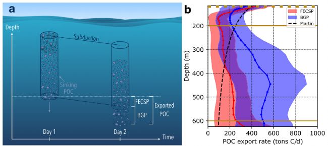 UVP6獲取的顆粒物粒徑譜與POC通量數(shù)據(jù)顯示,渦旋核心在西向漂移過程中持續(xù)俯沖,帶動水體中的POC向深海輸送。該機(jī)制(FECSP)在450米深度的碳輸出量達(dá)到239±156噸C/天,約占生物重力泵(BGP,647±377噸C/天)的1/4至1/2,成為渦旋環(huán)境下不可忽視的碳匯途徑。這一發(fā)現(xiàn)首次證實(shí)了全渦旋俯沖對碳輸出的顯著貢獻(xiàn),填補(bǔ)了傳統(tǒng)生物碳泵研究的空白。