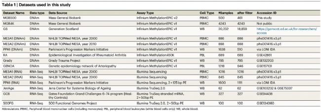 - DNAm數(shù)據(jù)集:納入6個大規(guī)模隊(duì)列,包括MESA(兩個時間點(diǎn):MESA1 n=886,MESA2 n=888)、PPMI(n=510)、RA(類風(fēng)濕關(guān)節(jié)炎隊(duì)列,n=689)、Grady(創(chuàng)傷項(xiàng)目,n=795)、GENOA(n=946)和本研究的MGB500隊(duì)列(n=461,935k芯片,年齡20-90歲)。此外使用MGB4K(n=4,243)和Generation Scotland(GS)(n=18,859)的DNAm數(shù)據(jù)和全因死亡率數(shù)據(jù)進(jìn)行生存分析驗(yàn)證。